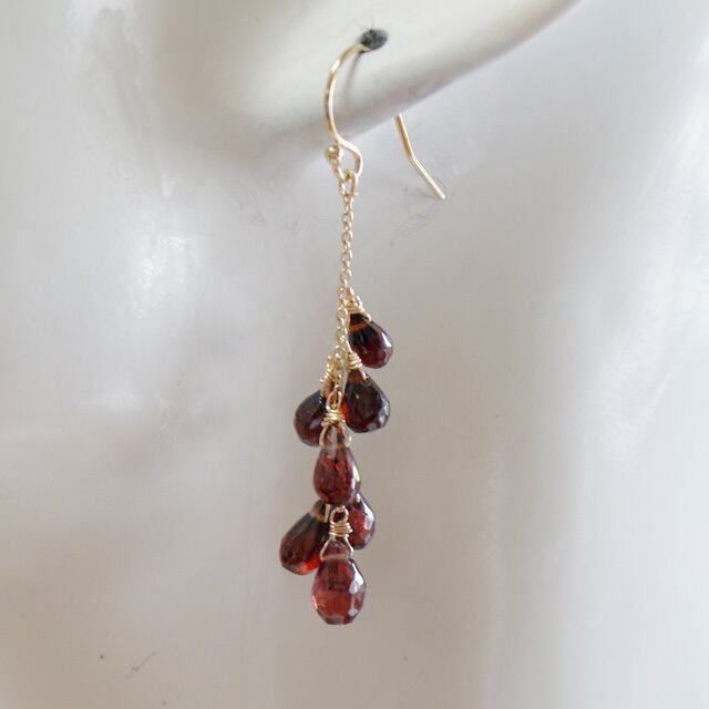 ドロップブリオレットカットのエレガントなガーネットのシャンデリアのようにあしらったピアス。程よい揺れ感は、表情や体の動きに合わせて様々に煌くブリオレットの粒はいろいろな光に透かして眺めたくなりそうです。