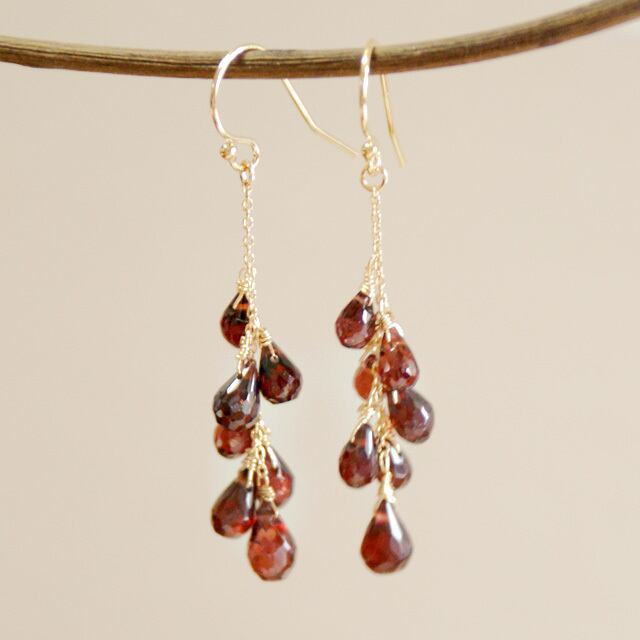 14Kgfワインレッド色のガーネットシャンデリアピアス