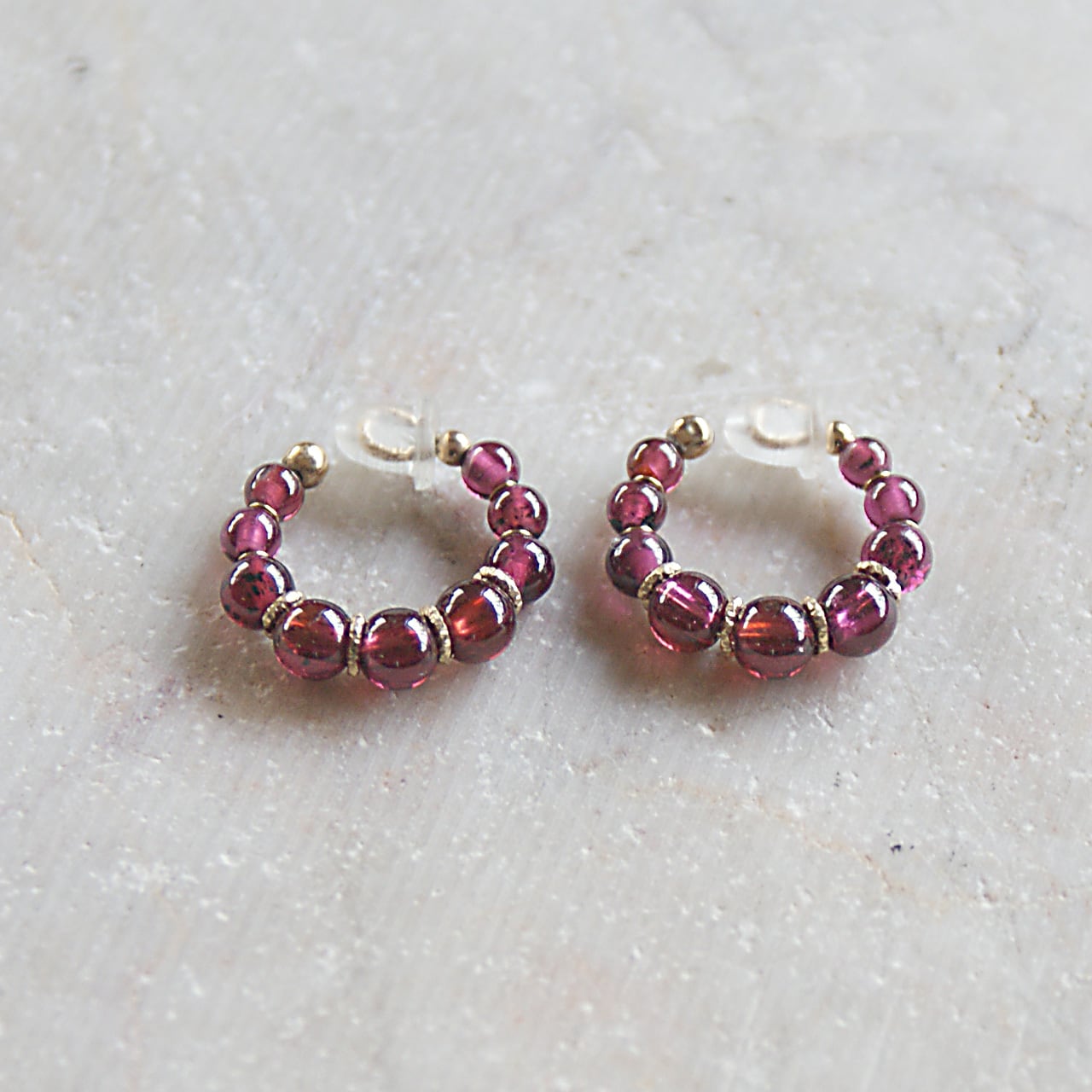 14Kgf:深いワインレッドが印象的なガーネットのノンホールピアス(ピアス風イヤリング)