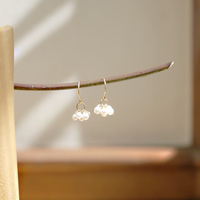 アコヤパールは、光沢のある美しいものを使用し一点一点丁寧に手作りしております。6粒を房状に束ねたアコヤパールを揺れる様に配して、ややボリュウム感もありかわいいデザインになっています。